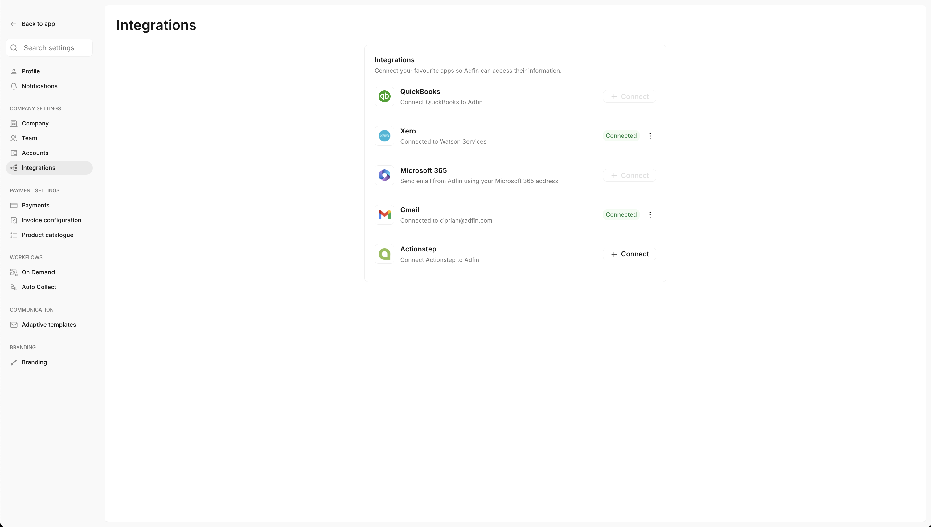 Users connect their accounting software through the Adfin Console.